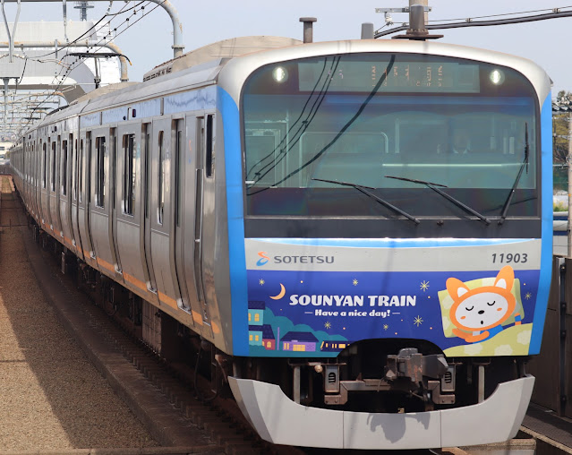 2022年3月から約1年間運転された、相模鉄道広報キャラクターのそうにゃんをラッピングした『9代目そうにゃんトレイン』(11000系11003F)が2023年3月24日で運転を終了し、同月27日の2008レ(平日67運用・海0602→横0638)より、『10代目そうにゃんトレイン』が11000系11001Fを用いて運転を開始しました。.JPG)